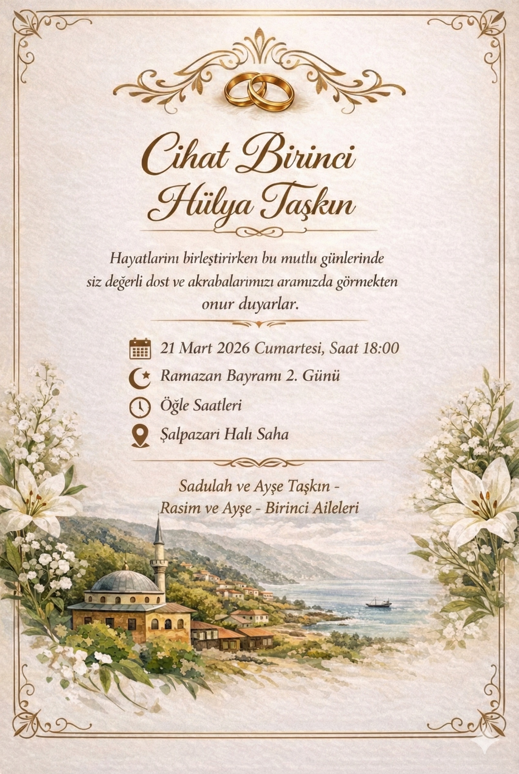 Cihat Birinci & Hülya Taşkın Hayatlarını birleştirirken bu mutlu günlerinde siz değerli dost ve akrabalarımızı aramızda görmekten onur duyarız.